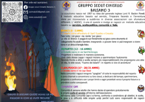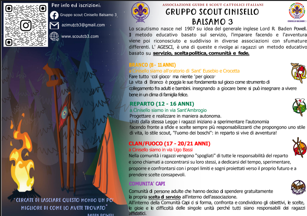 Lo scautismo nasce nel 1907 su idea del generale inglese Lord R. Baden Powell. Il metodo educativo basato sul servizio, l'imparare facendo e l'avventura viene poi riconosciuto e suddiviso in diverse associazioni con sfumature differenti. L' AGESCI, è una di queste e rivolge ai ragazzi un metodo educativo basato su servizio, scelta politica, comunità e fede. BRANCO (8 - 11 ANNI) “Fare tutto col gioco ma niente per gioco”. La vita di Branco è poggia le sue fondamenta sul gioco come strumento di collegamento fra adulti e bambini insegnando a giocare bene si può insegnare a vivere bene in un clima di famiglia felice. REPARTO (12 - 16 ANNI) “Progettare e realizzare in maniera autonoma”. Uniti dalla stessa Legge i ragazzi iniziano a sperimentare l'autonomia facendo fronte a sfide e scelte sempre più responsabilizzanti che propongono uno stile di vita, lo stile scout, "l'uomo dei boschi": in reparto si vive di avventura!